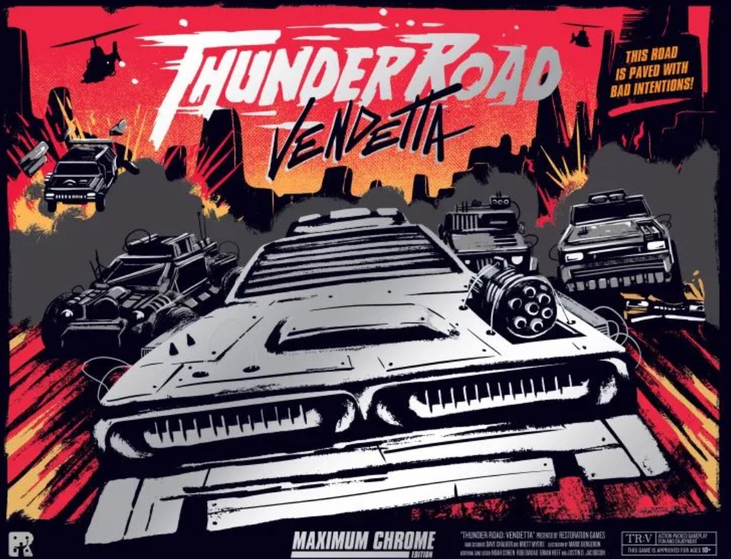 Thunder Road Vendetta n’est pas un jeu qui s’explique, c’est un jeu qui se vit. Il vous procure des aventures où vous allez faire l’ascenseur émotionnel. On oublie vite qui a gagné, beaucoup moins vite qui on a mis dans le ravin ou détruit grâce à l’hélicoptère. Le but n’est pas de gagner mais d’en mettre plein la gueule aux autres et qui sait, s’en sortir indemne. Allez, je reprends ma route en chantant.